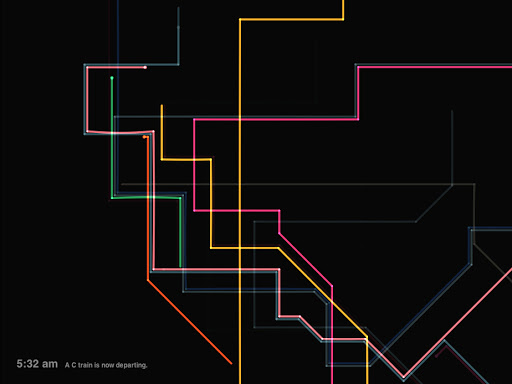 At www.mta.me, Conductor turns the New York subway system into an interactive string instrument. Using the MTA’s actual subway schedule, the piece begins in realtime by spawning trains which departed in the last minute, then continues accelerating through a 24 hour loop. The visuals are based on Massimo Vignelli’s 1972 diagram.