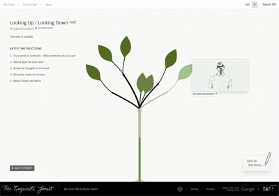 "This Exquisite Forest" is an online collaborative art experiment presented by Google and Tate Modern. The project lets users create short animations that build off one another as they explore a specific theme. It can be accessed via the website exquisiteforest.com and through a physical installation at Tate Modern (http://www.tate.org.uk/) from July 23, 2012.